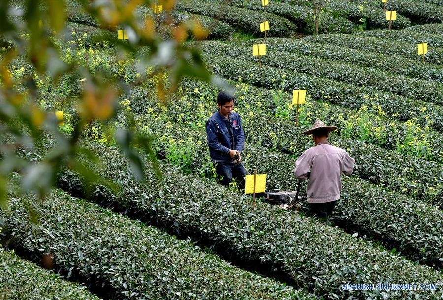 FUJIAN, 26 marzo, 2019 (Xinhua) -- Agricultores fertilizan un jardín de té, en el municipio de Xingcun de la ciudad de Wuyishan, provincia de Fujian, en el sureste de China, el 26 de marzo de 2019. Los jardines de té en Wuyishan entrarán en temporada de cosecha el mes próximo. (Xinhua/Wei Peiquan)