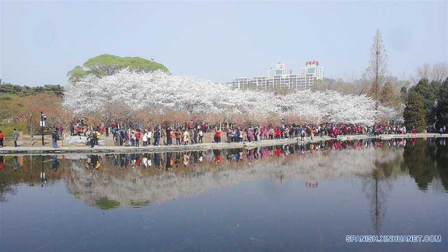 BEIJING, 26 marzo, 2019 (Xinhua) -- Imagen tomada con un teléfono celular de personas observando las flores de cerezo en el Parque Yuyuantan, en Beijing, capital de China, el 26 de marzo de 2019. (Xinhua/Zhang Chuanqi)