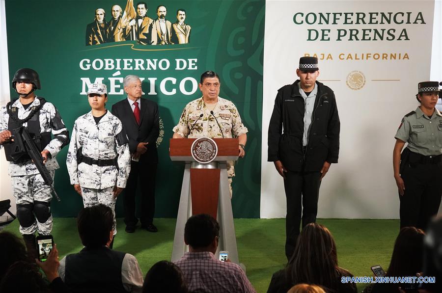 El presidente de México, Andrés Manuel López Obrador (i-atrás), escucha mientras el secretario de la Defensa Nacional (Sedena), Luis Cresencio Sandoval (c-frente) presenta un informe, durante una conferencia de prensa matutina celebrada en la ciudad de Tijuana, México, el 27 de marzo de 2019. El presidente de México, Andrés Manuel López Obrador, aseguró el miércoles que a más tardar en tres meses estará instalada la Guardia Nacional, un cuerpo de seguridad integrado con elementos de fuerzas armadas y civiles. (Xinhua/Str)