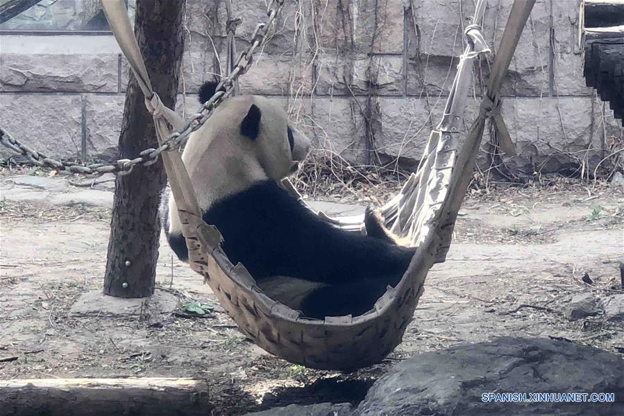 BEIJING, 31 marzo, 2019 (Xinhua) -- Imagen tomada con un teléfono móvil de un panda descansando en el Zoológico Beijing en Beijing, capital de China, el 31 de marzo de 2019. (Xinhua/Geng Xinning)