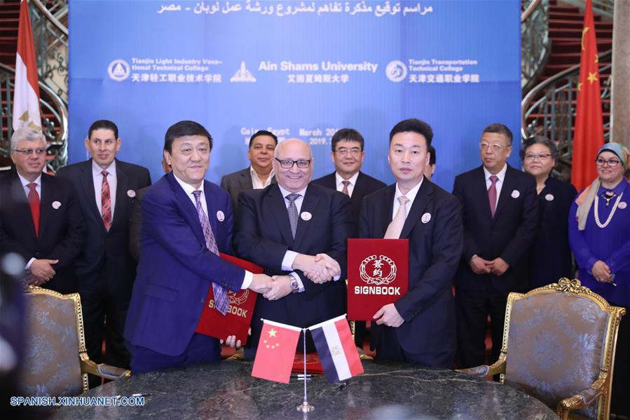 EL CAIRO, 31 mar (Xinhua) -- El Colegio Técnico Vocacional de Industrias Ligeras de Tianjin, el Colegio Técnico Vocacional de Transporte de Tianjin y la Universidad Ain Shams de Egipto firmaron hoy un memorándum de entendimiento para el Taller Luban Egipto en El Cairo.