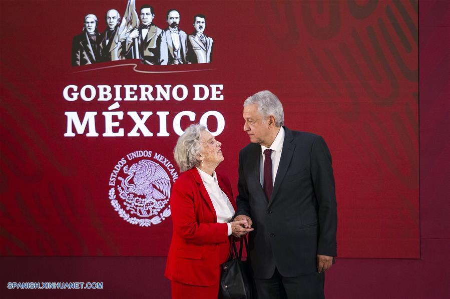 El presidente de México, Andrés Manuel López Obrador (d), participa junto a la escritora Elena Poniatowska (i), en una conferencia de prensa matutina en Palacio Nacional, en la Ciudad de México, capital de México, el 1 de abril de 2019. El presidente de México, Andrés Manuel López Obrador, expresó el lunes que deben "actuar con prudencia" y tener una "política de amistad", ante las afirmaciones del mandatario estadounidense, Donald Trump, de cerrar la frontera común. (Xinhua/Str)