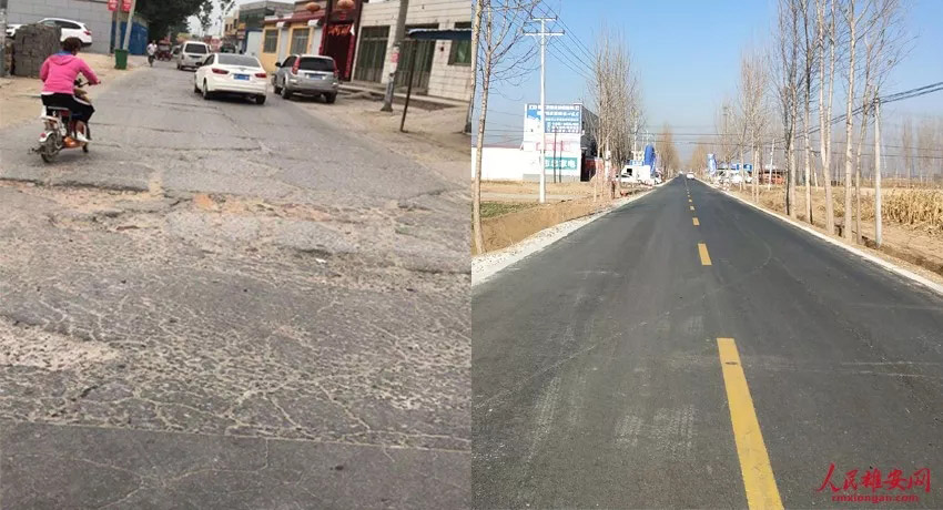 El 15 de septiembre de 2018, comenzaron los trabajos de acondicionamiento de la calle Rongjia. Se trata del primer camino rural renovado desde el establecimiento del área Nueva de Xiong'an. La imagen muestra la calle Rongjia antes y después de la transformación.