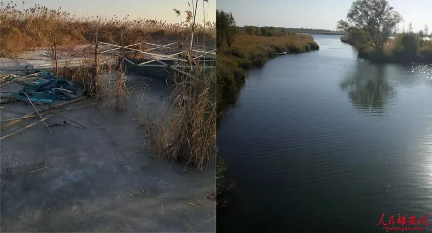 En septiembre de 2018, el área Nueva de Xiong'an emitió una “orden de no pesca” que prohíbe la acuicultura artificial en las aguas de Baiyangdian. En la actualidad, todas las instalaciones de acuicultura en los diques han sido eliminadas. La imagen muestra un dique antes y después de eliminar las instalaciones.