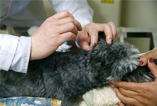 Una mascota se somete a un tratamiento de acupuntura en el hospital. [Foto: Zou Hong/ China Daily]