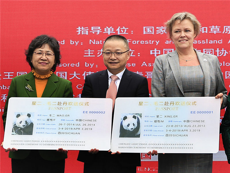 Marie Louise Flach de Neergaard (derecha), ministra consejera de la Embajada de Dinamarca en China, entrega las visas para dos pandas a Zhang Zhihe (centro), directora de la Base de Investigación de Cría de Panda Gigante de Chengdu en una ceremonia en Chengdu, Sichuan provincia, el miércoles. [Foto proporcionada a China Daily]