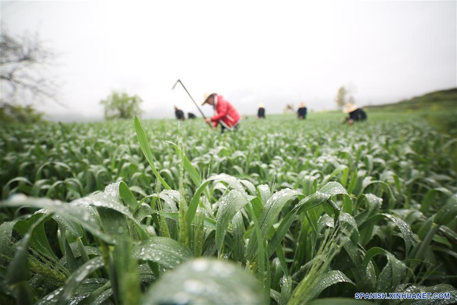 GUIZHOU, 4 abril, 2019 (Xinhua) -- Agricultores trabajan en un campo, en la villa de Yangliu del municipio de Changshi, condado de Dafang, Bijie, provincia de Guizhou, en el suroeste de China, el 4 de abril de 2019. (Xinhua/Luo Dafu)