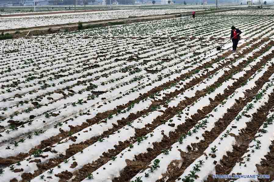 SHANDONG, 4 abril, 2019 (Xinhua) -- Un agricultor cuida de las papas en un campo cubierto de película de plástico, en la villa de Dehongzhuang del municipio de Chengtou, Zaozhuang, provincia de Shandong, en el este de China, el 4 de abril de 2019. (Xinhua/Li Zongxian)