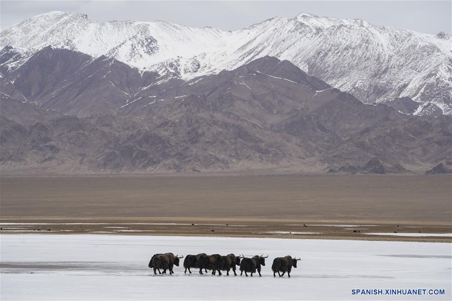 XINJIANG, 4 abril, 2019 (Xinhua) -- Imagen del 31 de marzo de 2019 de yaks salvajes caminando sobre un lago congelado en la Reserva Natural Nacional de las Monta?as de Altun, en la región autónoma de la etnia uygur de Xinjiang, en el noroeste de China. (Xinhua/Hu Huhu)