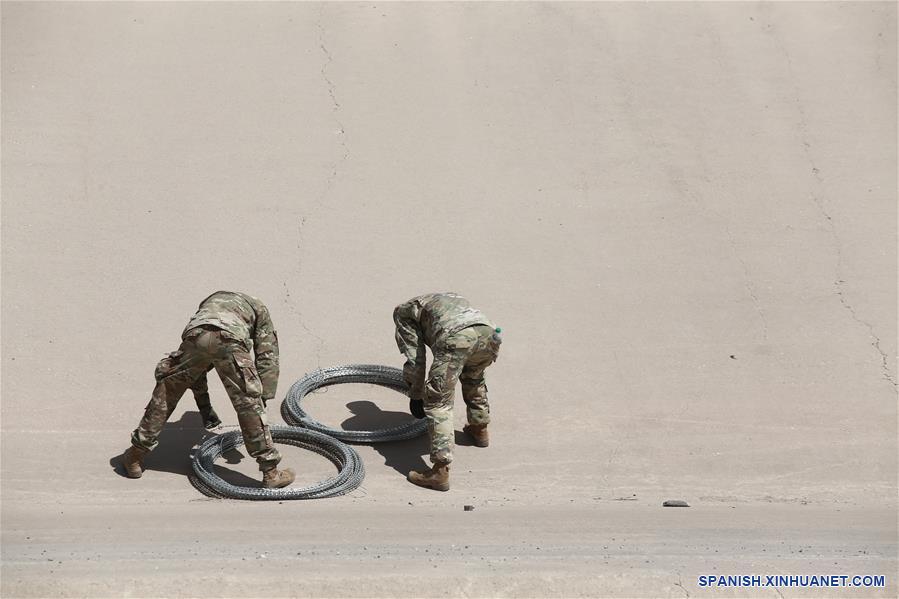 Soldados estadounidenses laboran durante los trabajos de colocación de alambre de púas en el muro fronterizo, visto desde Ciudad Juárez, México, el 4 de abril de 2019. De acuerdo con información de la prensa local, el jueves elementos del ejército estadounidense comenzaron la instalación de alambre de púas en el nuevo muro fronterizo que se construye en la frontera entre México y Estados Unidos, para intentar impedir la entrada de migrantes indocumentados. (Xinhua/Christian Torres)