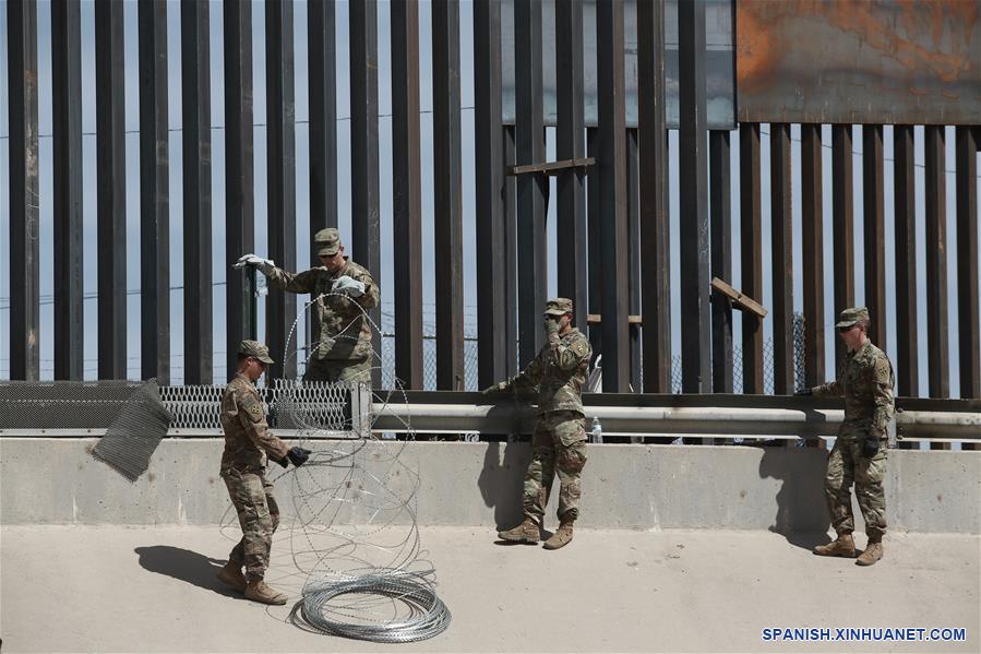 Soldados estadounidenses laboran durante los trabajos de colocación de alambre de púas en el muro fronterizo, visto desde Ciudad Juárez, México, el 4 de abril de 2019. De acuerdo con información de la prensa local, el jueves elementos del ejército estadounidense comenzaron la instalación de alambre de púas en el nuevo muro fronterizo que se construye en la frontera entre México y Estados Unidos, para intentar impedir la entrada de migrantes indocumentados. (Xinhua/Christian Torres)
