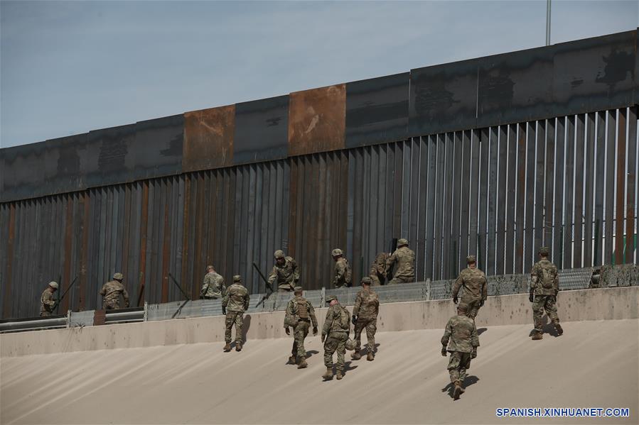 Soldados estadounidenses laboran durante los trabajos de colocación de alambre de púas en el muro fronterizo, visto desde Ciudad Juárez, México, el 4 de abril de 2019. De acuerdo con información de la prensa local, el jueves elementos del ejército estadounidense comenzaron la instalación de alambre de púas en el nuevo muro fronterizo que se construye en la frontera entre México y Estados Unidos, para intentar impedir la entrada de migrantes indocumentados. (Xinhua/Christian Torres)