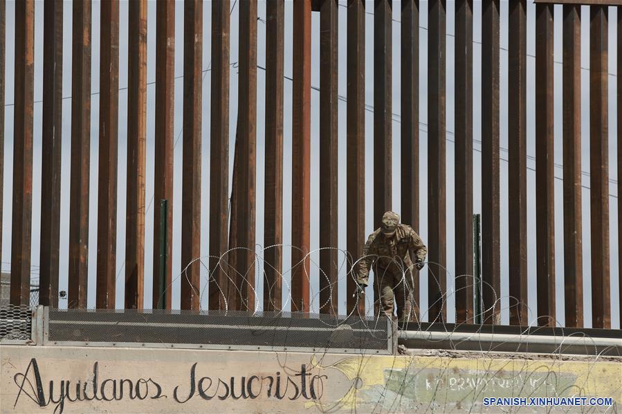 Un soldado estadounidense labora durante los trabajos de colocación de alambre de púas en el muro fronterizo, visto desde Ciudad Juárez, México, el 4 de abril de 2019. De acuerdo con información de la prensa local, el jueves elementos del ejército estadounidense comenzaron la instalación de alambre de púas en el nuevo muro fronterizo que se construye en la frontera entre México y Estados Unidos, para intentar impedir la entrada de migrantes indocumentados. (Xinhua/Christian Torres)