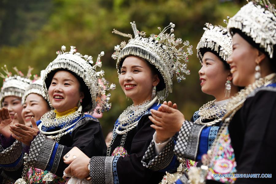 GUIZHOU, 7 abril, 2019 (Xinhua) -- Personas del grupo étnico miao reaccionan durante la celebración del festival "San Yue San", en el condado de Jianhe en la Prefectura Autónoma Miao y Dong de Qiandongnan, en la provincia de Guizhou, en el suroeste de China, el 7 de abril de 2019. "San Yue San", o tercer día del tercer mes en el calendario lunar chino, se celebra el 7 de abril este a?o. (Xinhua/Yang Wenbin)