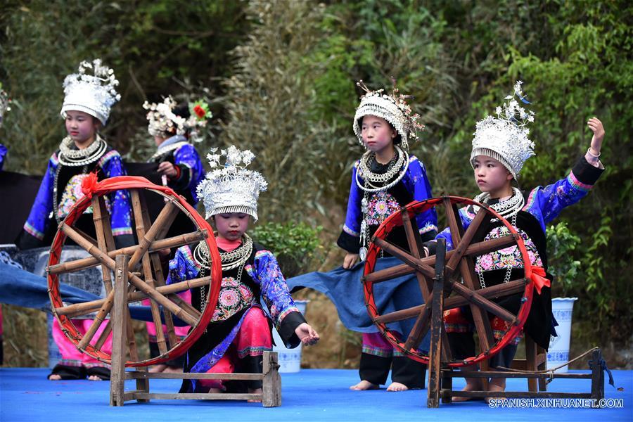 GUIZHOU, 7 abril, 2019 (Xinhua) -- Ni?as del grupo étnico miao participan en una actividad folclórica durante la celebración del festival "San Yue San", en el condado de Jianhe en la Prefectura Autónoma Miao y Dong de Qiandongnan, en la provincia de Guizhou, en el suroeste de China, el 7 de abril de 2019. "San Yue San", o tercer día del tercer mes en el calendario lunar chino, se celebra el 7 de abril este a?o. (Xinhua/Yang Wenbin)