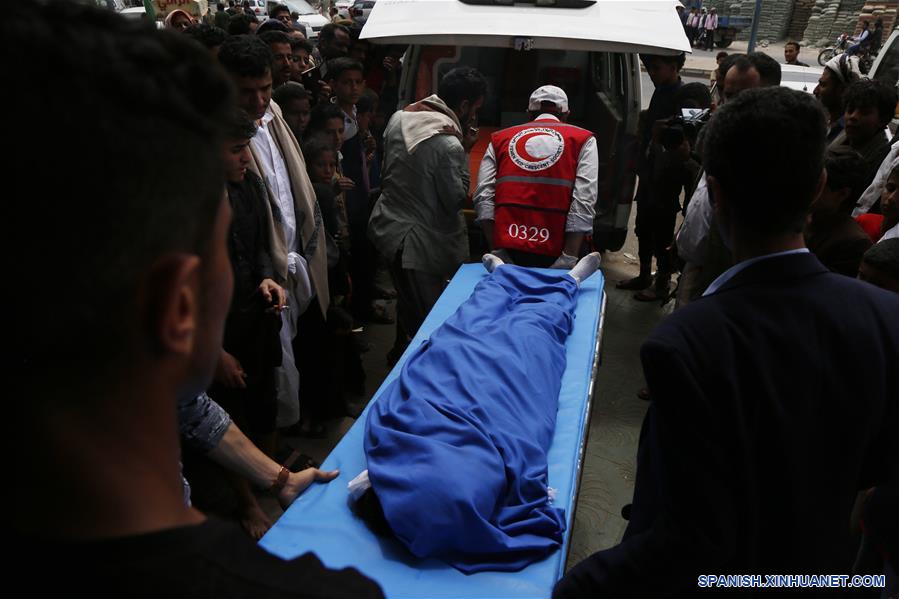 Personas cargan el cuerpo de un estudiante asesinado en un ataque aéreo en Saná, Yemen, el 7 de abril de 2019. La cifra de muertes subió a 11 y la de heridos a 39 luego de que la coalición encabezada por Arabia Saudí lanzó el domingo un ataque aéreo en la capital de Yemen, Saná, bajo control rebelde, dijo el Ministerio de Salud controlado por los rebeldes. (Xinhua/Mohammed Mohammed)