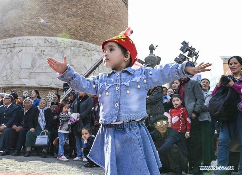 Un ni?o baila en la plaza del Gran Bazar Internacional de Xinjiang en Urumqi, capital de la región autónoma Uygur de Xinjiang, noroeste de China, el 4 de abril de 2019. El mercado, que ha sido testigo de un auge del turismo, recibió aproximadamente 1,33 millones de visitas solo en marzo. (Xinhua / Wang Fei)