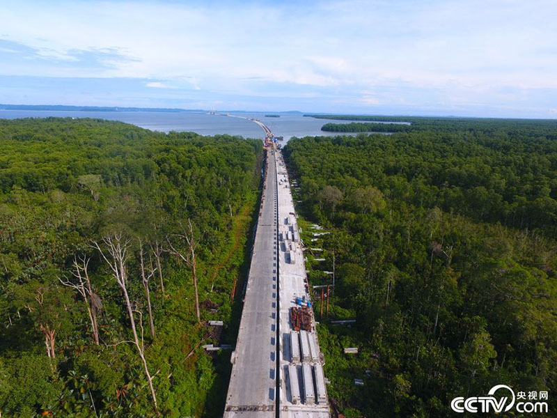 Una foto aérea del contrato CC4 del Puente de Temburong en construcción. [Foto / cctv.com]