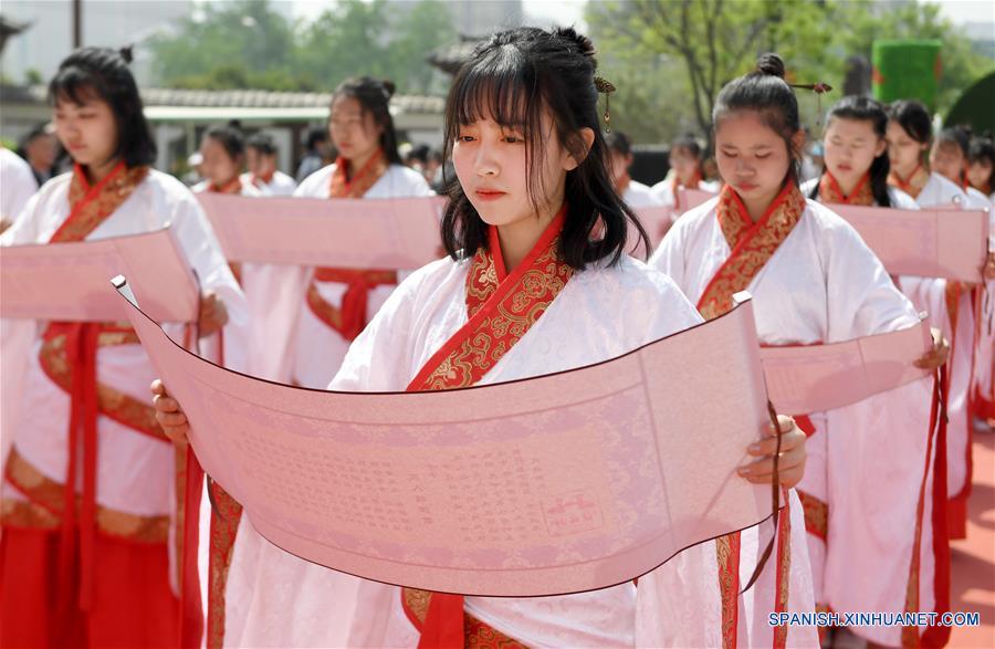 SHAANXI, 7 abril, 2019 (Xinhua) -- Estudiantes en vestimentas estilo Han participan en una ceremonia tradicional de la mayoría de edad, en Xi'an, capital de la provincia de Shaanxi, en el noroeste de China, el 7 de abril de 2019. Cincuenta estudiantes entre las edades de 16 y 20 participaron en la ceremonia de mayoría de edad. (Xinhua/Liu Xiao)