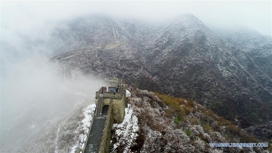 BEIJING, 9 abril, 2019 (Xinhua) -- Vista aérea del paisaje nevado de la sección de Mutianyu de la Gran Muralla, en Beijing, capital de China, el 9 de abril de 2019. (Xinhua/Bu Xiangdong)