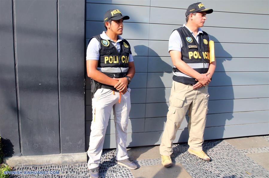 Imagen cedida por la Agencia Peruana de Noticias Andina, de policías montando guardia frente a la residencia del ex presidente peruano, Pedro Pablo Kuczynski, en Lima, Perú, el 10 de abril de 2019. La justicia peruana ordenó el miércoles la detención preliminar por 10 días del ex presidente Pedro Pablo Kuczynski (2016-2018), por la presunta comisión de lavado de activos en agravio del Estado. (Xinhua/Vidal Tarqui/ANDINA)