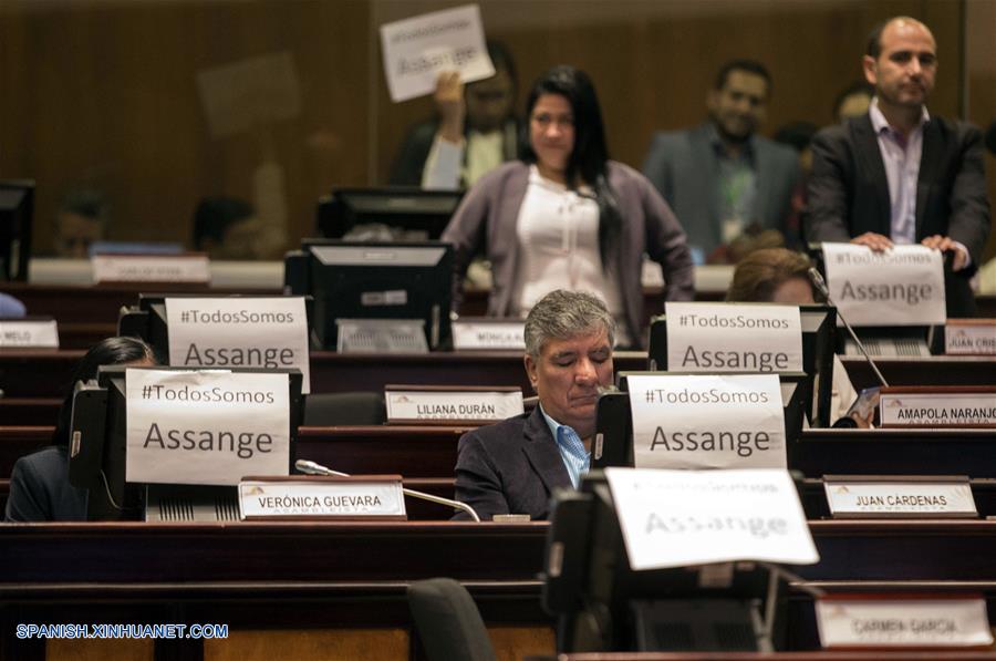 Asambleístas de la oposición al gobierno del presidente ecuatoriano, Lenin Moreno, reaccionan con pancartas durante la comparecencia del ministro de Relaciones Exteriores de Ecuador, José Valencia, ante el pleno de la Asamblea Nacional para informar sobre la "terminación del asilo diplomático" concedido al fundador de WikiLeaks, Julian Assange, en Quito, capital de Ecuador, el 11 de abril de 2019. Ecuador dejó sin efecto la nacionalidad ecuatoriana otorgada en diciembre de 2017 al fundador de WikiLeaks, el australiano Julian Assange, por "irregularidades" en su concesión, anunció el jueves el canciller ecuatoriano, José Valencia, después de que el gobierno ecuatoriano retiró el asilo diplomático al activista. (Xinhua/Santiago Armas)