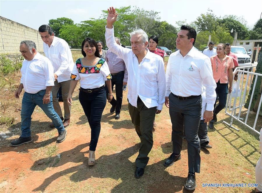 El presidente de México, Andrés Manuel López Obrador (2-d-frente), reacciona durante un recorrido, acompa?ado por el gobernador de Campeche, Alejandro Moreno Cárdenas (d), después de la entrega de las tarjetas de los Programas de Bienestar, en Hopelchén, estado de Campeche, México, el 13 de abril de 2019. De acuerdo con información de la prensa local, el presidente de México, Andrés Manuel López Obrador, entregó tarjetas a los beneficiarios de los Programas de Bienestar Social, en compa?ía del gobernador de Campeche, Alejandro Moreno Cárdenas, y la secretaria de Bienestar, María Luisa Albores González, en el municipio de Hopelchén. (Xinhua/Str)