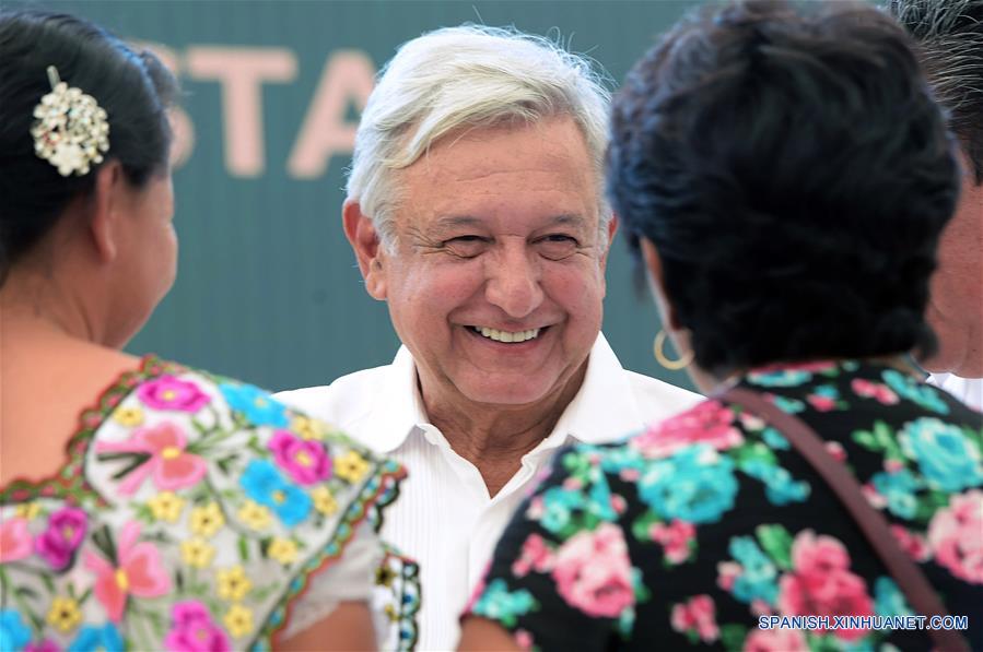 El presidente de México, Andrés Manuel López Obrador (c-atrás), interactúa con personas durante la entrega de las tarjetas de los Programas de Bienestar, en Hopelchén, estado de Campeche, México, el 13 de abril de 2019. De acuerdo con información de la prensa local, el presidente de México, Andrés Manuel López Obrador, entregó tarjetas a los beneficiarios de los Programas de Bienestar Social, en compa?ía del gobernador de Campeche, Alejandro Moreno Cárdenas, y la secretaria de Bienestar, María Luisa Albores González, en el municipio de Hopelchén. (Xinhua/Str)
