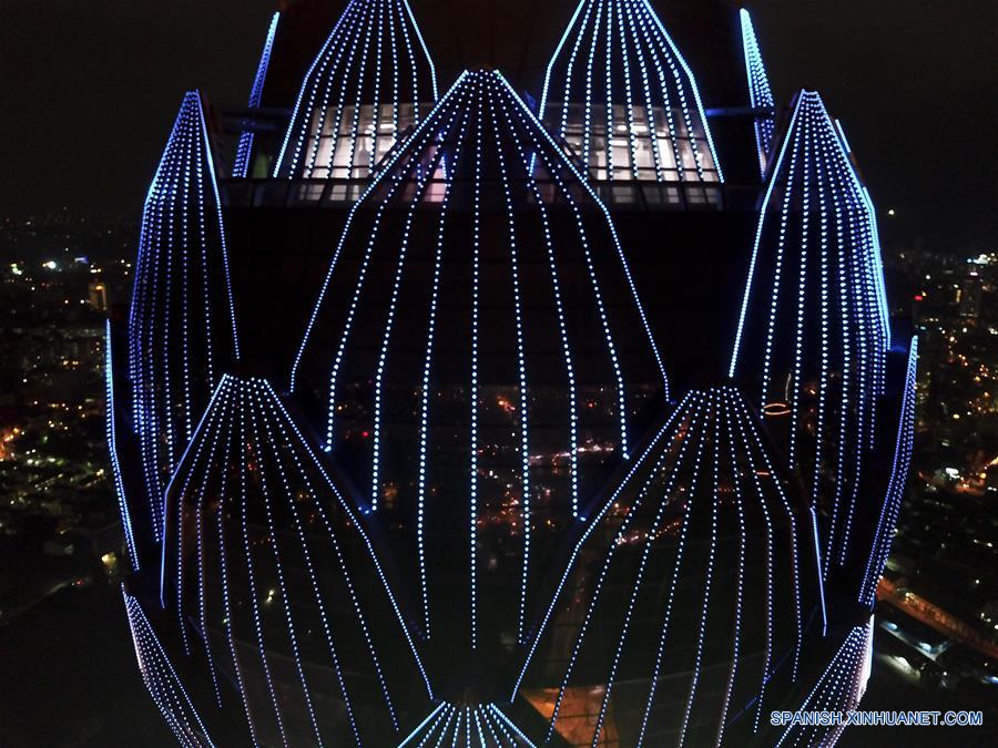 Imagen del 12 de abril de 2019 de una vista nocturna de la Torre Loto, en Colombo, capital de Sri Lanka. Bajo la Iniciativa de la Franja y la Ruta, Sri Lanka y China firmaron el acuerdo de la Torre Loto en 2012 para costruir la torre de televisión más elevada de Asia del Sur, con China National Electronics Import and Export Corporation (CEIEC) siendo el contratista general. Para que la torre sea un éxito, tanto los trabajadores chinos como los locales han trabajado arduamente durante a?os. El proyecto será completado más adelante este a?o, y para entonces, la Torre Loto no sólo funcionará como una torre de televisión, sino también como hotel, centro comercial y centro de conferencias. (Xinhua/Guo Lei)