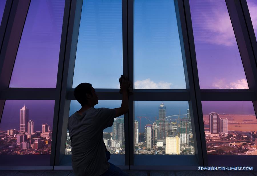 Imagen del 10 de abril de 2019 de un trabajador realizando labores de limpieza en el interior de la Torre Loto, en Colombo, capital de Sri Lanka. Bajo la Iniciativa de la Franja y la Ruta, Sri Lanka y China firmaron el acuerdo de la Torre Loto en 2012 para costruir la torre de televisión más elevada de Asia del Sur, con China National Electronics Import and Export Corporation (CEIEC) siendo el contratista general. Para que la torre sea un éxito, tanto los trabajadores chinos como los locales han trabajado arduamente durante a?os. El proyecto será completado más adelante este a?o, y para entonces, la Torre Loto no sólo funcionará como una torre de televisión, sino también como hotel, centro comercial y centro de conferencias. (Xinhua/Guo Lei)