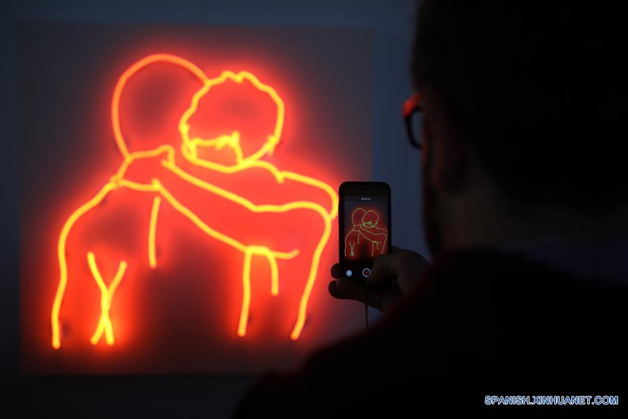 Una persona toma fotografías de una obra exhibida durante la 28 edición de la feria de arte contemporáneo, ArteBa, en la ciudad de Buenos Aires, capital de Argentina, el 13 de abril de 2019. De acuerdo con infomación de la prensa local, la 28 edición de ArteBa cuenta con más de 80 galerías, más de 15 secciones, además de visitas guiadas, y se llevará a cabo hasta el 14 de abril. (Xinhua/Martín Zabala)