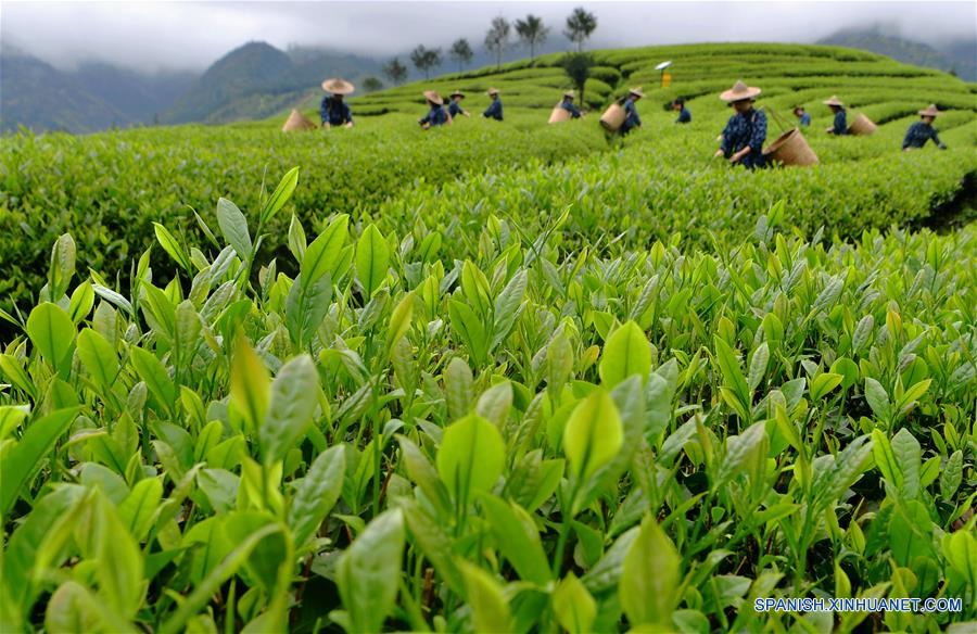FUJIAN, 14 abril, 2019 (Xinhua) -- Agricultores de té recolectando hojas de té en un jardín ecológico de la villa de Chaoyang del municipio Xingcun, Wuyishan, en la provincia de Fujian, en el sureste de China, el 14 de abril de 2019. La villa Chaoyang del municipio de Xingcun celebró el domingo un evento de cultura popular tradicional, orando por la cosecha del té. (Xinhua/Wei Peiquan)
