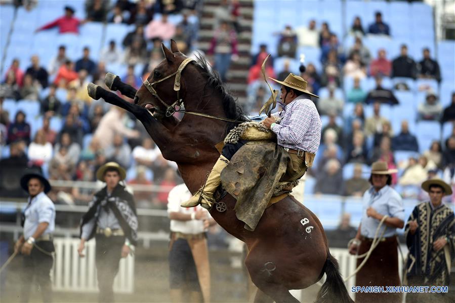 MONTEVIDEO, 15 abril, 2019 (Xinhua) -- Un gaucho monta un caballo durante las domas de la edición 94 de la Semana Criolla del Prado 2019, en el rodeo de la Rural del Prado, en Montevideo, capital de Uruguay, el 15 de abril de 2019. La Semana Criolla del Prado se realiza todos los a?os en un predio de la Asociación Rural en el barrio Prado de la capital uruguaya, acercando la cultura“gauchesca” y la tradición del campo a la capital. La atracción principal del evento es el Concurso de Jineteadas, declaradas Deporte Nacional desde abril de 2006. El evento se lleva a cabo del 14 al 21 de abril. (Xinhua/Nicolás Celaya)
