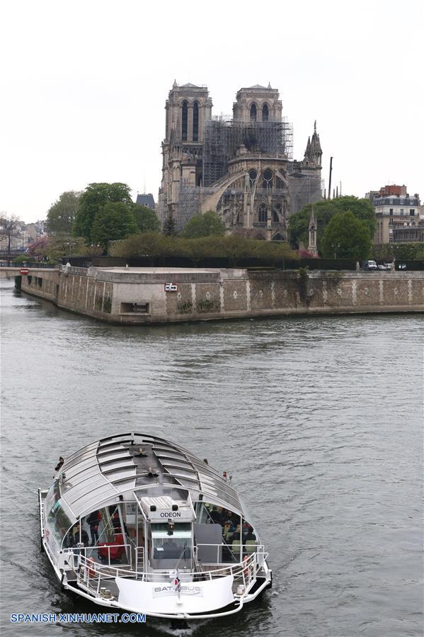 PARIS, 16 abril, 2019 (Xinhua) -- Un barco navega frente a la da?anda catedral de Notre Dame después de un incendio, en París, Francia, el 16 de abril de 2019. El presidente de Francia, Emmanuel Macron, prometió el lunes reconstruir la catedral de Notre Dame, devastada por un incendio, en un lapso de cinco a?os e hizo un llamado a los franceses para que permanezcan unidos. (Xinhua/Gao Jing)