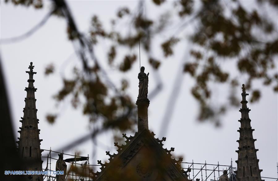 PARIS, 16 abril, 2019 (Xinhua) -- Vista de esculturas en el techo de la da?ada catedral de Notre Dame después de un incendio, en París, Francia, el 16 de abril de 2019. El presidente de Francia, Emmanuel Macron, prometió el lunes reconstruir la catedral de Notre Dame, devastada por un incendio, en un lapso de cinco a?os e hizo un llamado a los franceses para que permanezcan unidos. (Xinhua/Gao Jing)