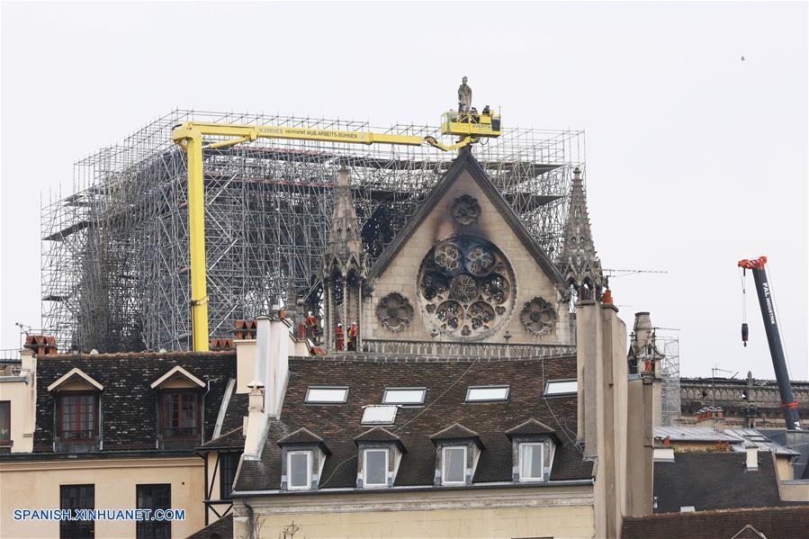 PARIS, 16 abril, 2019 (Xinhua) -- Trabajadores laboran en la da?ada catedral de Notre Dame después de un incendio, en París, Francia, el 16 de abril de 2019. El presidente de Francia, Emmanuel Macron, prometió el lunes reconstruir la catedral de Notre Dame, devastada por un incendio, en un lapso de cinco a?os e hizo un llamado a los franceses para que permanezcan unidos. (Xinhua/Gao Jing)