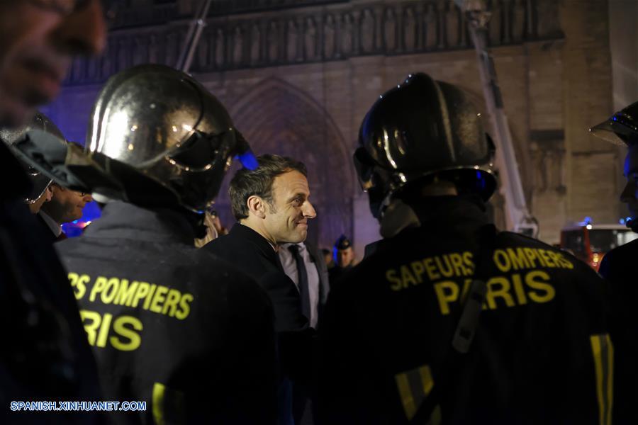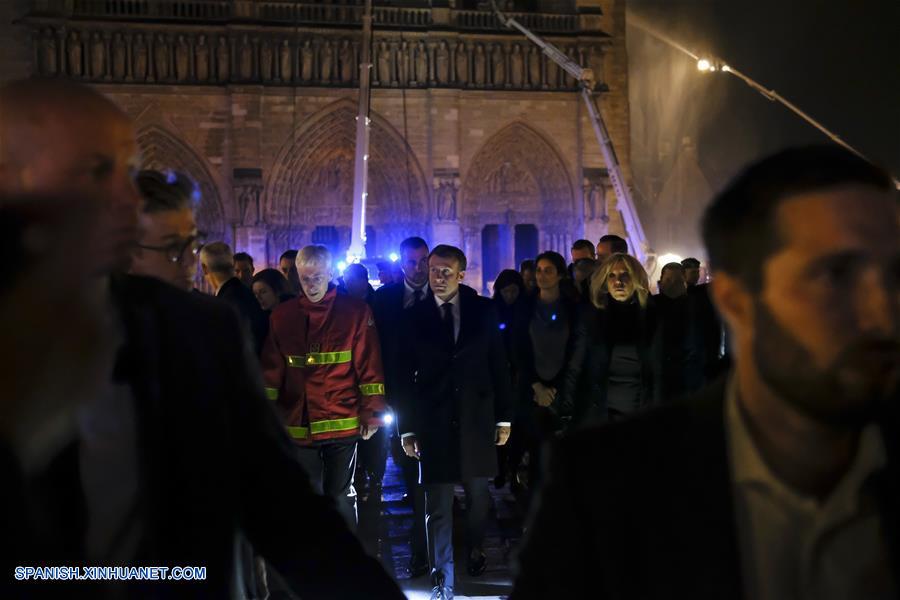Imagen del 15 de abril de 2019 del presidente de Francia, Emmanuel Macron (c), permaneciendo con rescatistas en la catedral de Notre Dame, en el centro de París, capital de Francia. Emmanuel Macron prometió el lunes reconstruir Notre Dame. "Estemos orgullosos, porque construimos esta catedral hace más de 800 a?os", dijo. "La hemos construido y, a lo largo de los a?os, la hemos dejado crecer y mejorar. Así que solemnemente digo esta noche que: esta catedral será reconstruida". El incendio que ha devastado la catedral parisina de Notre Dame fue extinguido tras 15 horas desde su inicio, confirmaron el martes los bomberos. (Xinhua/Alexandre Karmen)