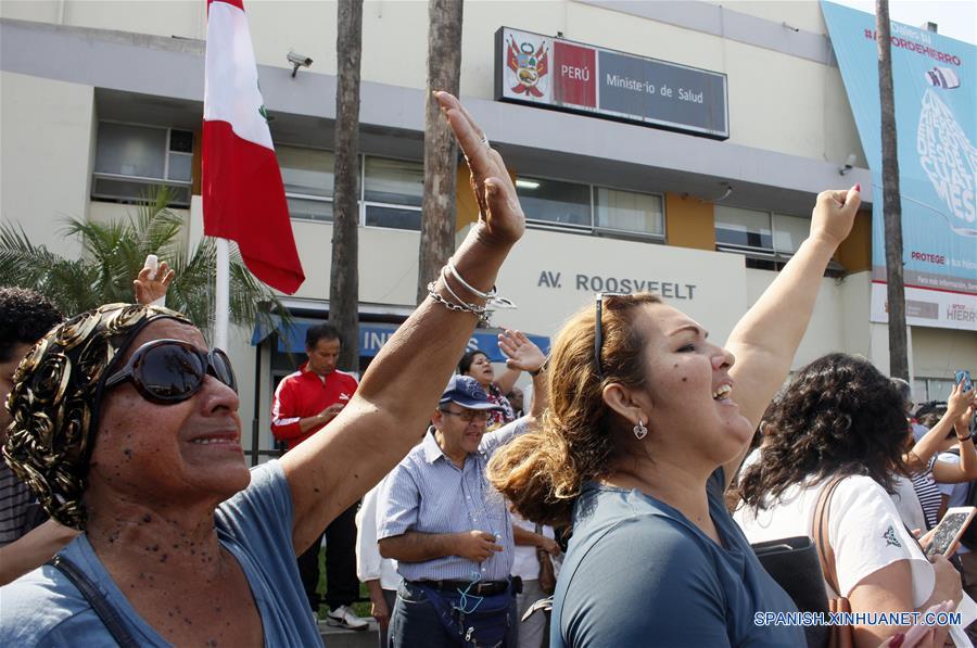 Simpatizantes del ex presidente peruano, Alan García, reaccionan frente al Hospital Nacional Casimiro Ulloa, en el distrito de Miraflores, provincia de Lima, Perú, el 17 de abril de 2019. El presidente de Perú, Martín Vizcarra, afirmó el miércoles estar "consternado" por la muerte del ex mandatario Alan García (1985-1990 / 2006-2011), luego de haberse pegado un tiro en la cabeza para evitar su detención por el caso de corrupción de la constructora brasile?a Odebrecht. (Xinhua/Luis Camacho)