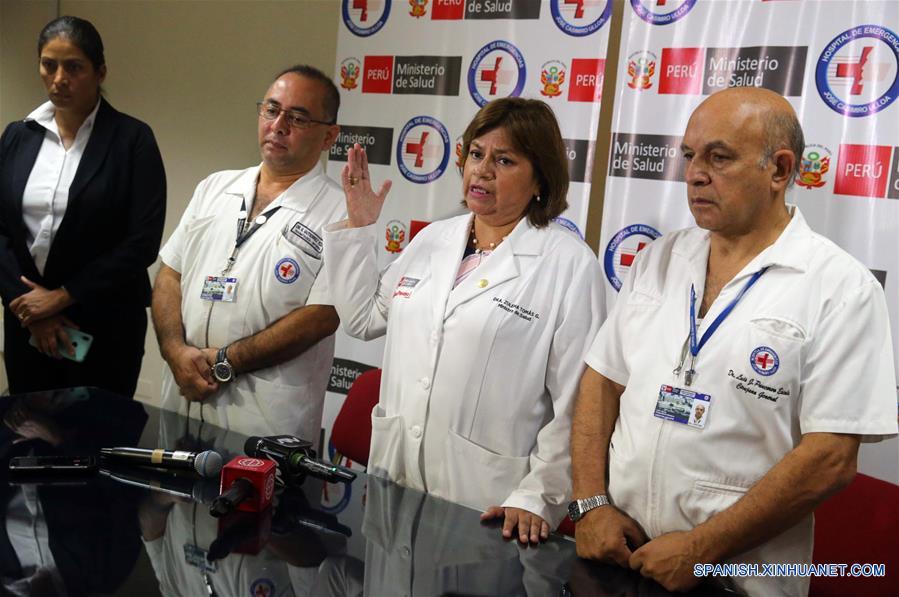 Imagen cedida por la Agencia Peruana de Noticias Andina de la ministra de Salud de Perú, Zulema Tomás (2-d), participando durante una conferencia de prensa sobre el estado de salud del ex presidente peruano Alan García, en el interior del Hospital Nacional Casimiro Ulloa donde fue internado de emergencia, en el distrito de Miraflores, provincia de Lima, Perú, el 17 de abril de 2019. El presidente de Perú, Martín Vizcarra, afirmó el miércoles estar "consternado" por la muerte del ex mandatario Alan García (1985-1990 / 2006-2011), luego de haberse pegado un tiro en la cabeza para evitar su detención por el caso de corrupción de la constructora brasile?a Odebrecht. (Xinhua/Vidal Tarqui/ANDINA)