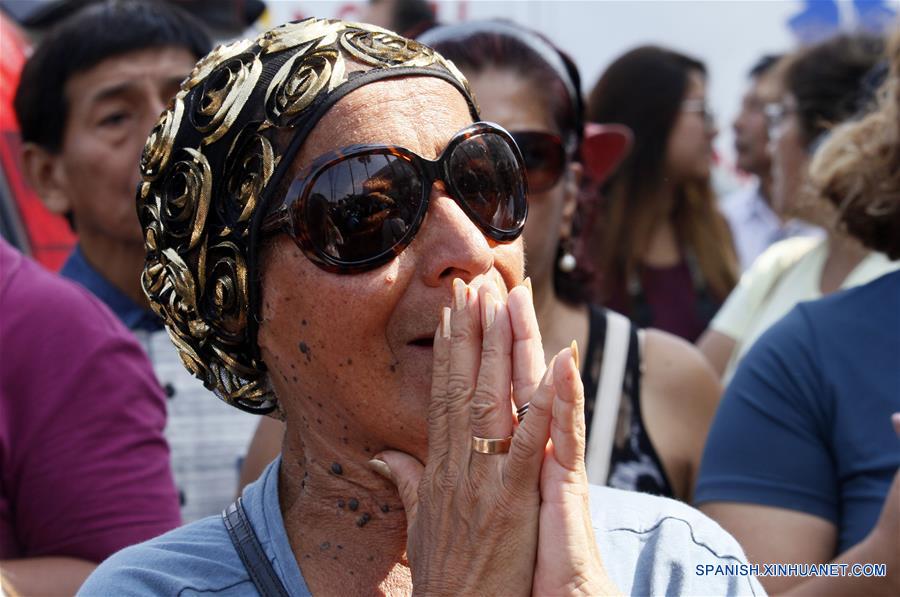 Una simpatizante del ex presidente peruano, Alan García, reacciona frente al Hospital Nacional Casimiro Ulloa, en el distrito de Miraflores, provincia de Lima, Perú, el 17 de abril de 2019. El presidente de Perú, Martín Vizcarra, afirmó el miércoles estar "consternado" por la muerte del ex mandatario Alan García (1985-1990 / 2006-2011), luego de haberse pegado un tiro en la cabeza para evitar su detención por el caso de corrupción de la constructora brasile?a Odebrecht. (Xinhua/Luis Camacho)