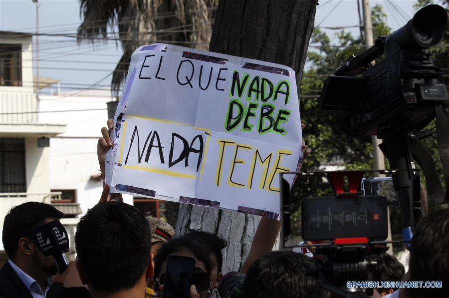 Una persona no simpatizante del ex presidente peruano, Alan García, sostiene un cartel en el exterior del Hospital Nacional Casimiro Ulloa, en el distrito de Miraflores, provincia de Lima, Perú, el 17 de abril de 2019. El presidente de Perú, Martín Vizcarra, afirmó el miércoles estar "consternado" por la muerte del ex mandatario Alan García (1985-1990 / 2006-2011), luego de haberse pegado un tiro en la cabeza para evitar su detención por el caso de corrupción de la constructora brasile?a Odebrecht. (Xinhua/Luis Camacho)