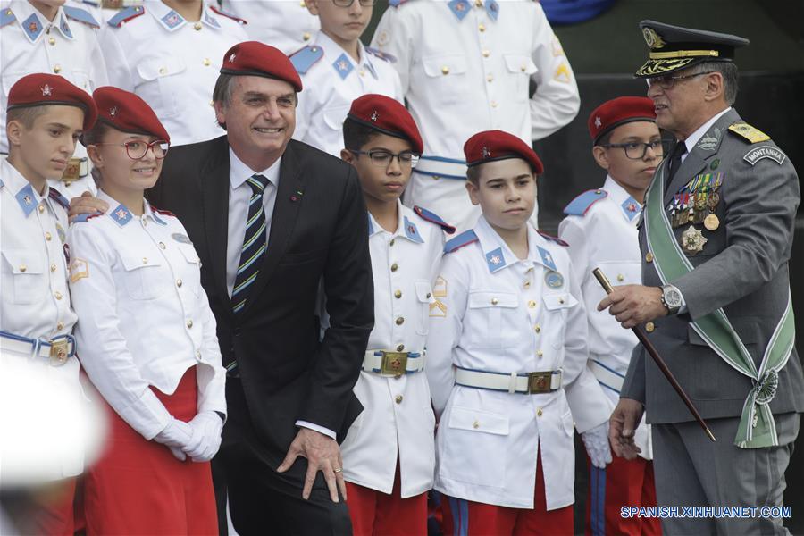El presidente brasile?o, Jair Bolsonaro (3-i), y el comandante del Ejército, el general Edson Leal Pujol (d), asisten a una ceremonia en conmemoración del Día del Ejército, en Brasilia, Brasil, el 17 de abril de 2019. De acuerdo con información de la prensa local, Bolsonaro expresó su deseo de que todas las escuelas en el país sean iguales a las del Ejército, durante la ceremonia en la que se llevó a cabo un desfile de las fuerzas castrenses así como de estudiantes de colegios militares. (Xinhua/Lucio Tavora)