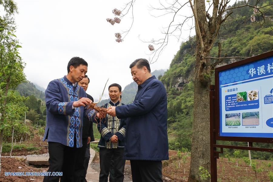 El presidente chino, Xi Jinping, también secretario general del Comité Central del Partido Comunista de China y presidente de la Comisión Militar Central, conversa con un aldeano para conocer el progreso de la reducción de la pobreza y de la resolución de problemas destacados incluyendo el cumplimiento de las necesidades básicas de alimentos y ropa y la garantización de la educación obligatoria, la atención médica básica y la vivienda segura, en la aldea de Huaxi del distrito autónomo de la etnia tujia de Shizhu, en Chongqing, en el suroeste de China, el 15 de abril de 2019. Xi realizó el lunes una visita de inspección a la municipalidad de Chongqing, en el suroeste de China. (Xinhua/Ju Peng)
