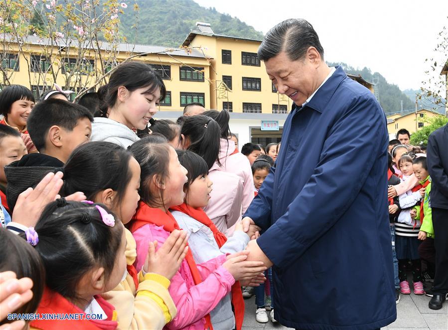 El presidente chino, Xi Jinping, también secretario general del Comité Central del Partido Comunista de China y presidente de la Comisión Militar Central, conversa con alumnos de una escuela primaria en el poblado de Zhongyi del distrito autónomo de la etnia tujia de Shizhu, en Chongqing, en el suroeste de China, el 15 de abril de 2019. Xi realizó el lunes una visita de inspección a la municipalidad de Chongqing, en el suroeste de China. (Xinhua/Xie Huanchi)