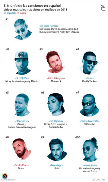 Madrid,18/04/2019(El Pueblo en Línea) - Desde que ?Despacito? batió todos los récords habidos y por haber y conquistó el mercado estadounidense, el espa?ol como idioma oficial del pop ya era una realidad. A la prensa anglosajona le costaba reconocerlo, pero ya no ha podido seguir negando la evidencia y empiezan a asomar voces que anuncian el cambio de paradigma. Así lo ha hecho Jon Caramanica, crítico musical del diario estadounidense ?The New York Times?, al comprobar dos hechos incuestionables: Ozuna, J Balvin y Bad Bunny fueron, en este orden, los artistas más escuchados en Youtube durante 2018. Y ocho de las diez canciones más vistas el a?o pasado estaban interpretadas por artistas de habla hispana, destaca ABC.
