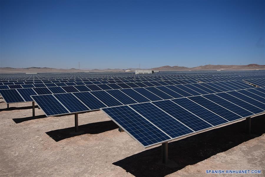 Imagen del 26 de marzo de 2019, de una vista de placas fotovoltáicas en el complejo solar Cerro Dominador, en Sierra Gorda, en la región de Antofagasta, Chile. En Sierra Gorda, en el desierto chileno de Atacama, donde está el nivel más alto de radiación solar en la Tierra, se construye el complejo solar Cerro Dominador, la primera planta termosolar de América Latina que producirá energía las 24 horas del día. (Xinhua/Jorge Villegas)