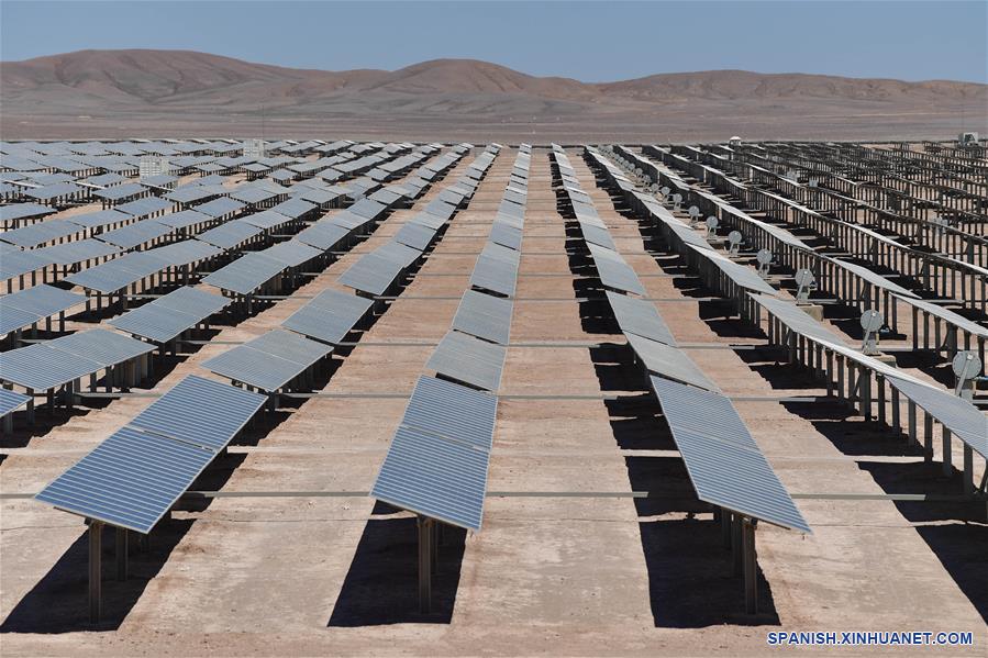Imagen del 26 de marzo de 2019, de una vista de placas fotovoltáicas en el complejo solar Cerro Dominador, en Sierra Gorda, en la región de Antofagasta, Chile. En Sierra Gorda, en el desierto chileno de Atacama, donde está el nivel más alto de radiación solar en la Tierra, se construye el complejo solar Cerro Dominador, la primera planta termosolar de América Latina que producirá energía las 24 horas del día. (Xinhua/Jorge Villegas)