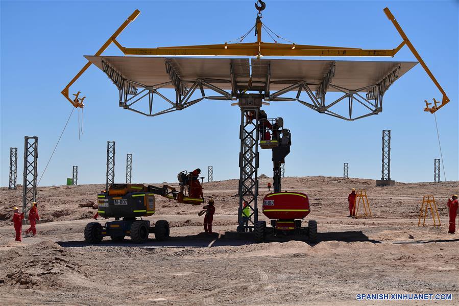 Imagen del 26 de marzo de 2019, de personas laborando en el complejo solar Cerro Dominador, en Sierra Gorda, en la región de Antofagasta, Chile. En Sierra Gorda, en el desierto chileno de Atacama, donde está el nivel más alto de radiación solar en la Tierra, se construye el complejo solar Cerro Dominador, la primera planta termosolar de América Latina que producirá energía las 24 horas del día. (Xinhua/Jorge Villegas)