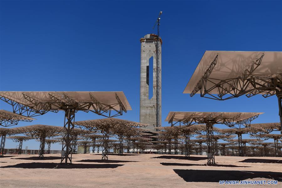 Imagen del 26 de marzo de 2019, de una vista del campo de helióstatos y la torre en el complejo solar Cerro Dominador, en Sierra Gorda, en la región de Antofagasta, Chile. En Sierra Gorda, en el desierto chileno de Atacama, donde está el nivel más alto de radiación solar en la Tierra, se construye el complejo solar Cerro Dominador, la primera planta termosolar de América Latina que producirá energía las 24 horas del día. (Xinhua/Jorge Villegas)