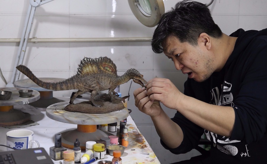 Zhao Chuang dibuja con suavidad los colores de un modelo de dinosaurio. [Foto por Chen Zebing / China Daily]